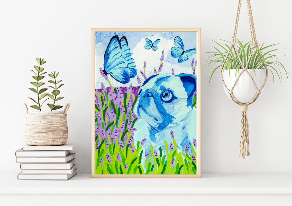Puggyonwall July 22, 2019Full resolution (1200 × 848) ← Previous Next → Curious Pug in lavender field looking at blue butterflies.